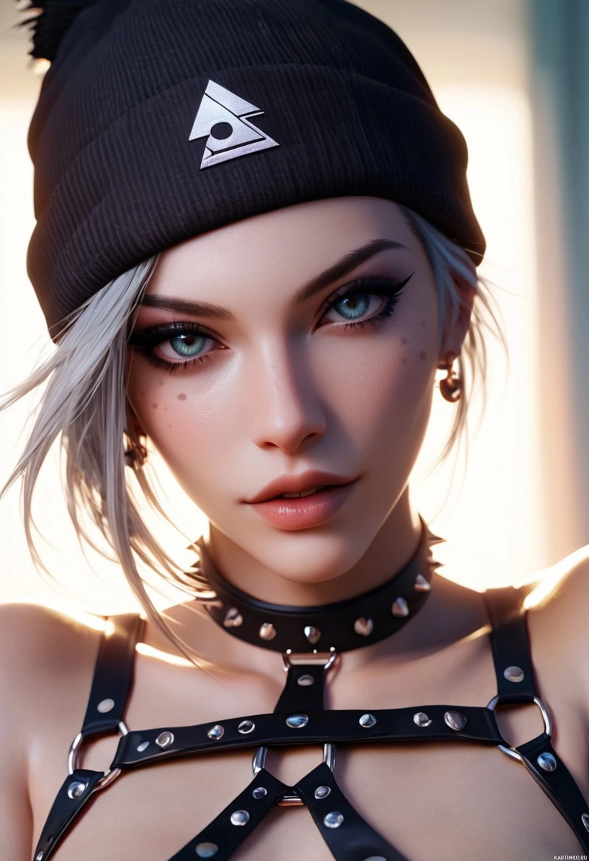 На картинке запечатлена молодая женщина с белыми волосами. На голове у неё чёрная шапка с видимым логотипом или знаком. У неё заметны пирсинг в ушах и носу. Макияж включает тёмную подводку и тушь, что придает ей эффектный вид. Она одета в чёрную майку с фактурным дизайном, напоминающим кожу. На шее у неё чокер, сделанный, судя по всему, из чёрной кожи или похожего материала. У неё несколько аксессуаров: на левом ухе – серьга, а в носу – кольцо. Её выражение лица нейтральное, но во взгляде чувствуется уверенность. Освещение подчеркивает черты её лица и создает тень под подбородком, что говорит о сильном источнике света над ней, возможно, от солнца или студийного освещения.