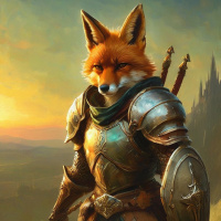 На картинке стоит рыжая лиса на зеленом холме под оранжевым небом, напоминающим рассвет или закат. Лиса изображена с человеческими чертами: в одной лапе она держит меч, в другой – щит, воплощая образ воина. На ней доспехи из золотых и зеленых пластин, а взгляд направлен прямо на зрителя, создавая внушительный силуэт. На заднем плане, на скале, возвышается замок, добавляя картинке нотку сказочности или историчности.