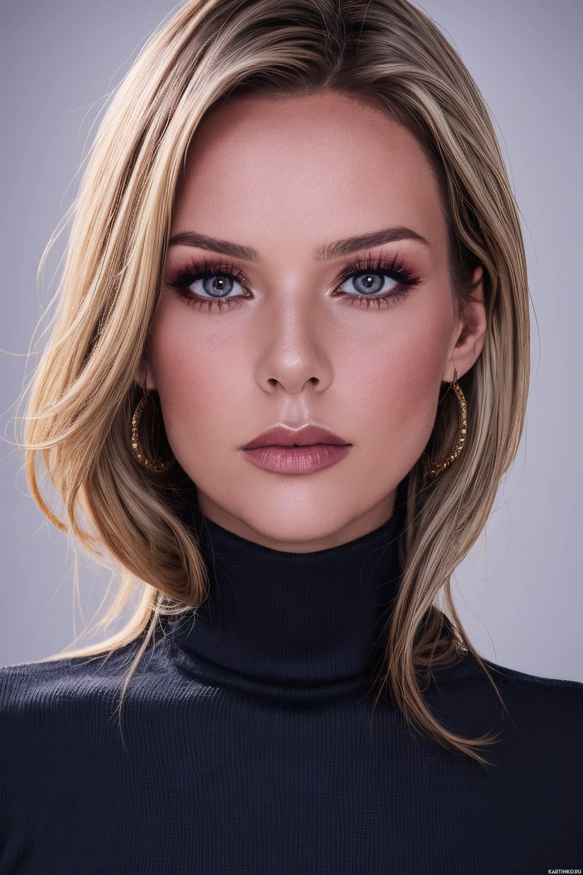 На картинке изображена женщина с выразительной внешностью. У неё короткие волосы, цвет кожи светлый, возможно европейского происхождения, можно сказать, «блондинка». Макияж включает в себя яркие тени: голубые по краям, переходящие в чёрные у внутренних уголков, что придаёт взгляду глубину. Также на щеках и губах деликатный розовый оттенок, создающий элегантный и одновременно дерзкий образ. Виден небольшой серьги в одном ухе. Одежда темная и лаконичная: чёрный водолазка без каких-либо деталей, вроде пуговиц или украшений. Выражение лица нейтральное, рот слегка приоткрыт, что создает впечатление задумчивости или уверенности. Фон – светло-серый, что обеспечивает контраст с моделью.