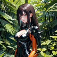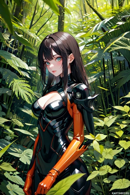 На картинке запечатлена женщина с длинными каштановыми волосами, стоящая на фоне, похожего на лес – влажная земля, поросшие мхом камни и стволы деревьев. На ней обтягивающий комбинезон из черной кожи с оранжевыми акцентами или отметинами на руках, груди и бедрах. Её поза выражает уверенность или готовность к действию, она стоит, положив руки на бедра. Общая атмосфера картинки драматичная, и она отсылает к научно-фантастическим жанрам благодаря футуристичному стилю её костюма.
