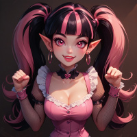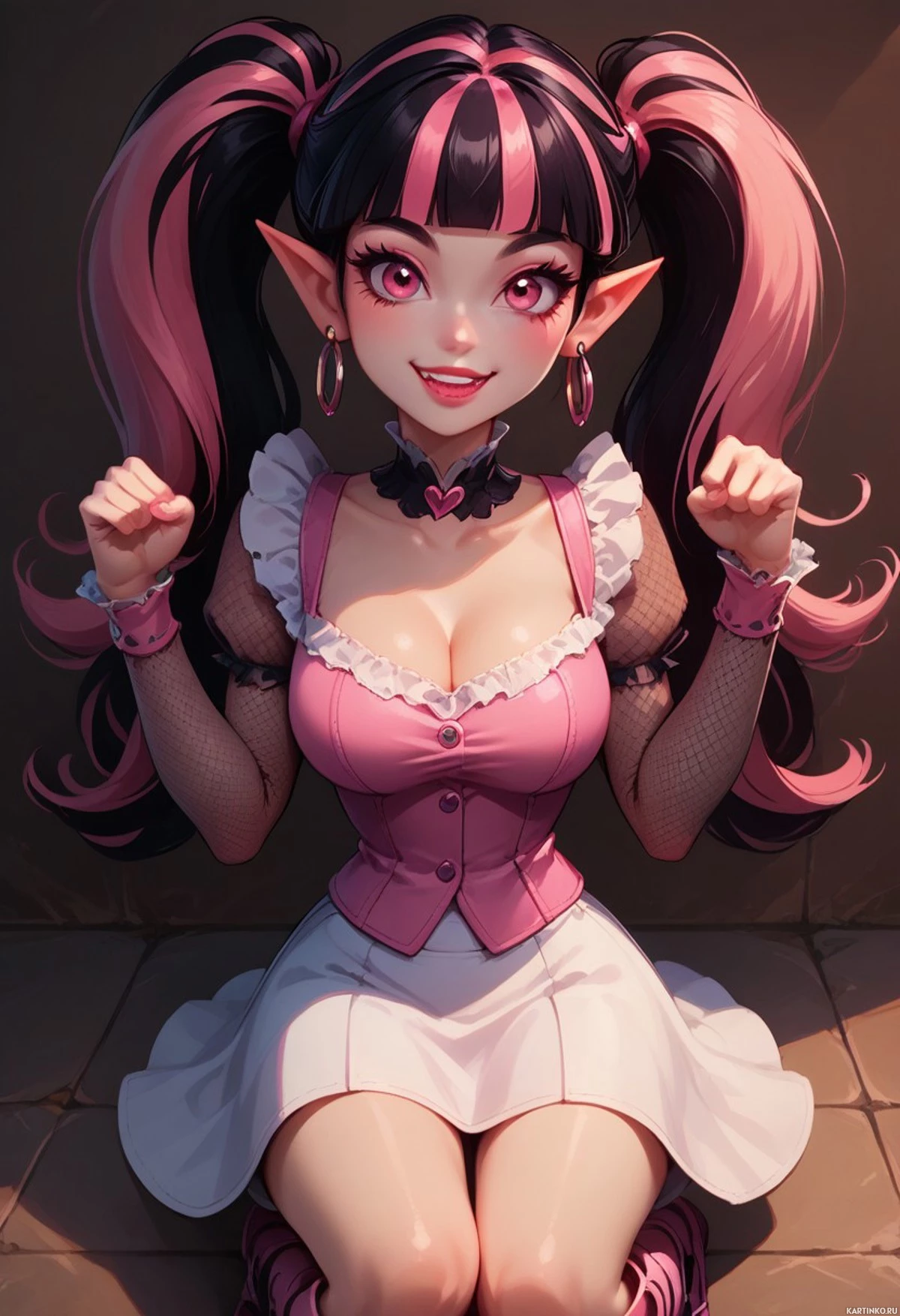 The image portrays a fantasy-themed character with an exaggerated smile, kneeling on one knee while holding her cheeks. She has pink hair styled into two buns on either side of her head and is wearing a corset top with puffy sleeves, a ruffled skirt, fishnet stockings, and black boots with gold accents. The character is set against a plain background.