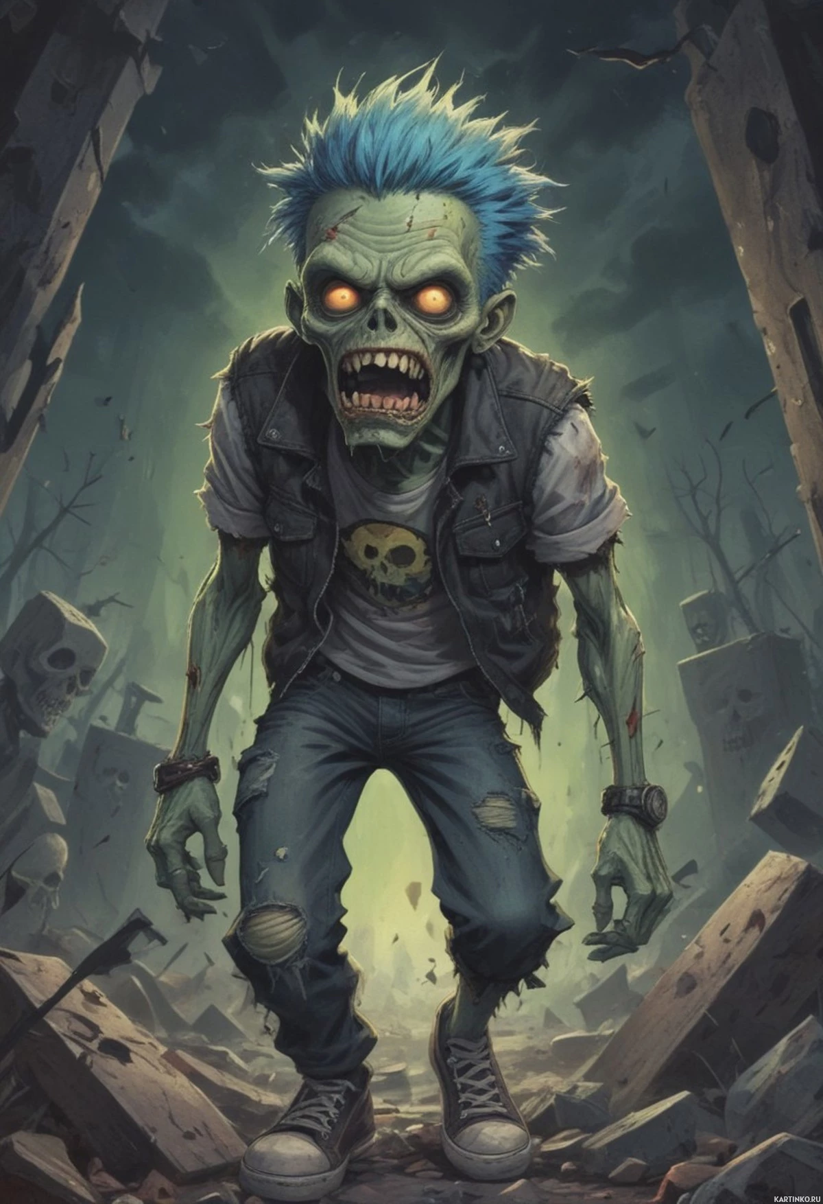 На картинке изображено фантастическое существо, похожее на гоблина. У него яркая синяя кожа, заостренные уши и выразительные красные глаза, которые передают гнев или беспокойство. Существо стоит в темном подземелье, окруженное каменными стенами и большим аркой, через которую пробивается слабый свет. На переднем плане валяются расколотые камни, а внизу картинки можно увидеть череп. Общая атмосфера пронизана фэнтези и ужасом, что подчеркивается напряженным выражением лица существа.