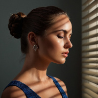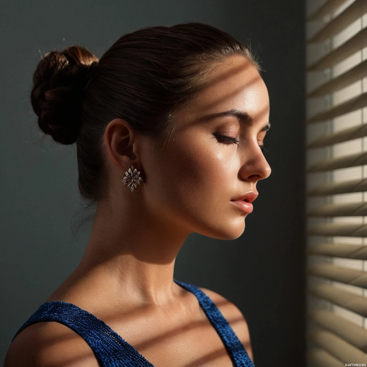 На картинке запечатлена женщина, смотрящая в окно, с повернутой в сторону головой. У неё высокие скулы, пухлые губы и крупные серьги-кольца с мерцающим дизайном, похожим на бриллианты или кристаллы. Макияж глаз включает чётко подчёркнутые ресницы, а брови красиво оформлены. Волосы у неё собраны в высокую причёску, и кажется, что она слегка загорелая. На ней одета одежда с формальным вырезом, что может говорить о том, что она одета для какого-то мероприятия. Кожа у неё выглядит здоровой и сияющей, а мягкое освещение подчёркивает черты лица, не создавая резких теней. Окно закрыто жалюзи, которые приоткрыты, позволяя проникать небольшому количеству естественного света.