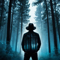 На картинке изображён мужчина, стоящий посреди леса, залитого лунным светом. На нём кожаная куртка и чёрная шляпа-федора, создающие его силуэт, пока он смотрит вдаль. На заднем плане – густые деревья, образующие плотный полог над головой. Одежда мужчины и лесная местность намекают на ночное приключение.