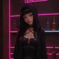 The image features a woman standing in front of a backdrop with shelves displaying various bottles and bar accessories. She has long dark hair and is wearing a black hooded cloak over a fitted black outfit, which includes a leather-like top. Her makeup is done to accentuate her features, and she has a confident gaze directed towards the camera. The lighting in the image is characterized by pink hues that highlight the subject against the darker background.