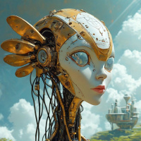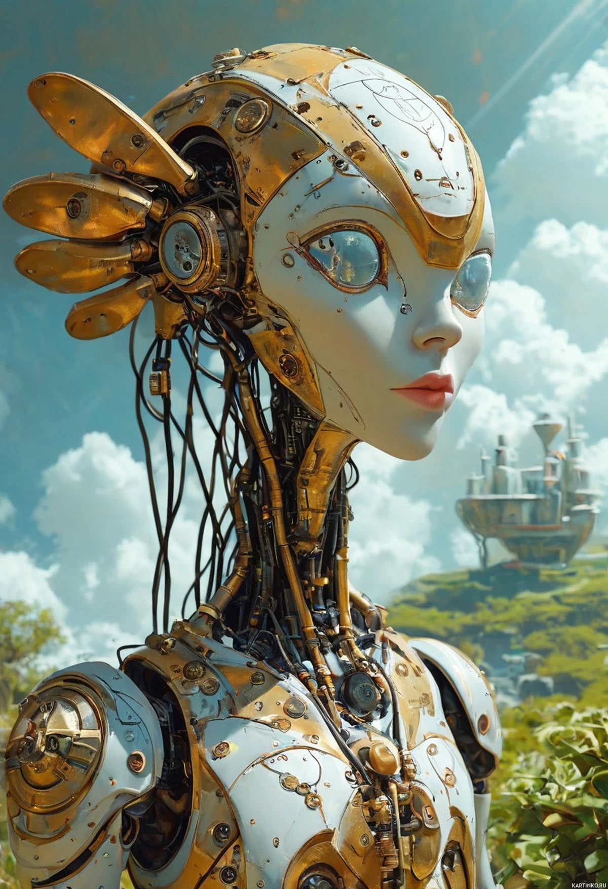 На картинке изображен гуманоидный робот с человеческим лицом и механическими деталями, указывающими на передовые технологии. У него есть крылья, похожие на крылья ангела или птицы, и голубые глаза. Кожа робота имеет светлый оттенок, возможно, имитирующий человеческий цвет лица, а на губах – легкая задумчивость. На заднем плане – элементы, отсылающие к фэнтезийному или научно-фантастическому сеттингу. Пологие холмы и, кажется, замок, возвышающийся над ними, указывают на средневековый или фантастический стиль архитектуры. Небо ясное, с белыми облаками, создавая ощущение спокойствия, несмотря на футуристический сюжет. Общее впечатление от картинки тяготеет к научно-фантастическим мотивам с оттенком фэнтези благодаря смешению человеческих и механических элементов.
