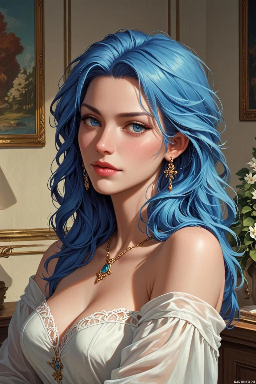 На картинке запечатлена молодая женщина с длинными голубыми волосами и светлой кожей. У нее слегка приоткрыт рот, как будто она заговорила или позирует для фотографии. На ней светлый топ с кружевной отделкой на шее. Фон размыт, кажется, это интерьер, украшенный декоративными элементами.