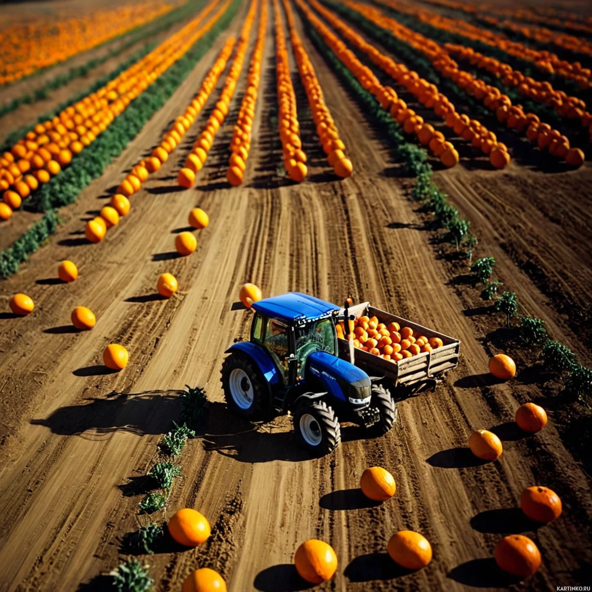 На картинке поле, на котором в длинные ряды высажены оранжевые тыквы, уходящие к горизонту. На переднем плане, справа, синий трактор тянет деревянную телегу, полную тыкв. Земля сухая и пыльная, что говорит о засушливом климате. Небо ясное и…