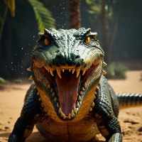 На картинке реалистично изображен крокодил в пейзаже, напоминающем древний период. Заметны скалистая местность и, возможно, окаменелости или кости на заднем плане. Крокодил с раскрытой пастью демонстрирует острые зубы, а его глаза широко открыты, создавая впечатление настороженности или агрессии. Детализированная текстура кожи воссоздает внешний вид настоящего крокодила с гребнями на спине и шее. Стиль картинки указывает на то, что она может быть частью рекламных материалов для игры, фильма или подобного развлекательного продукта.