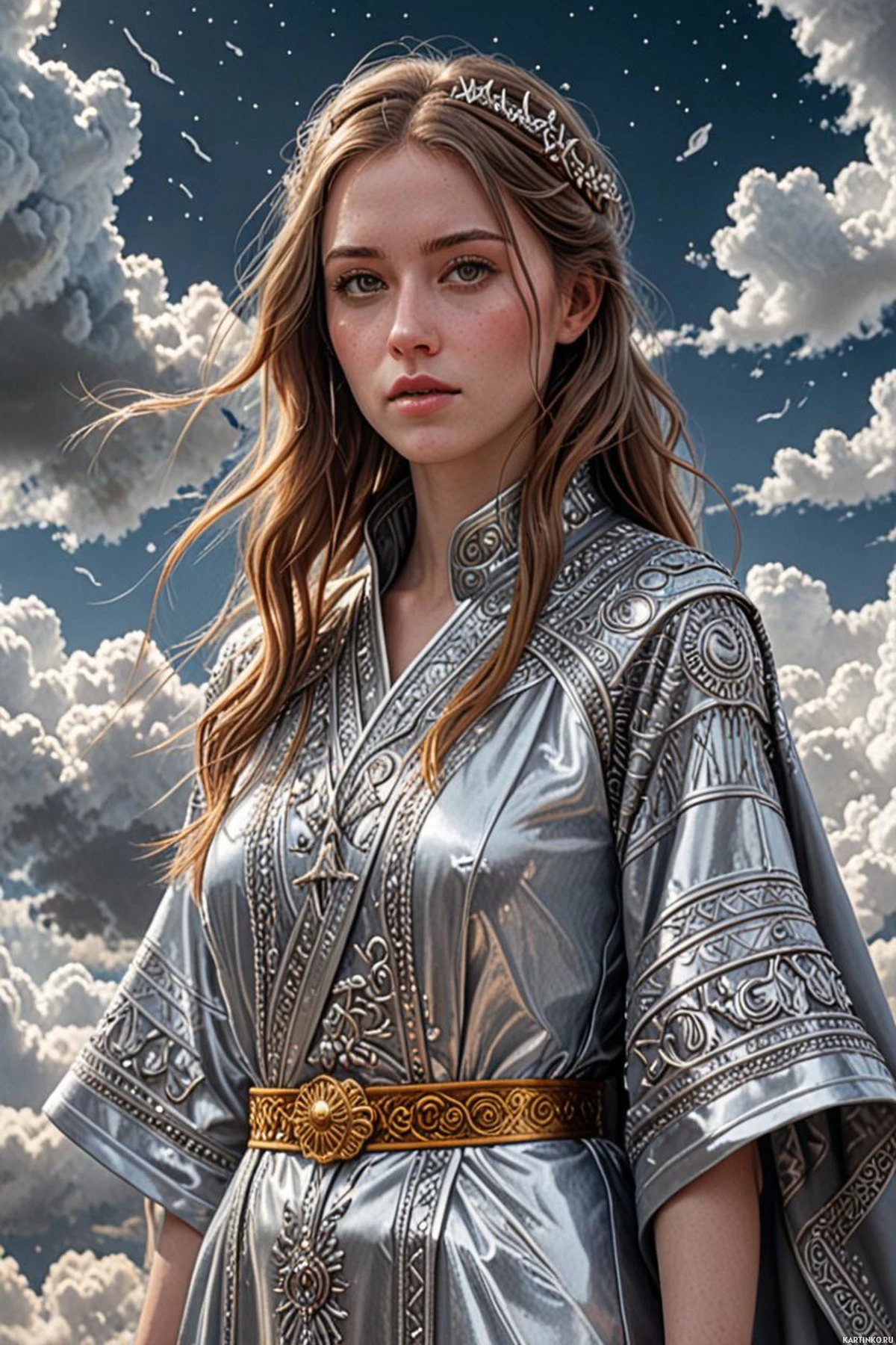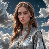 an air of mystery to her persona. The background is ethereal with soft clouds, adding to