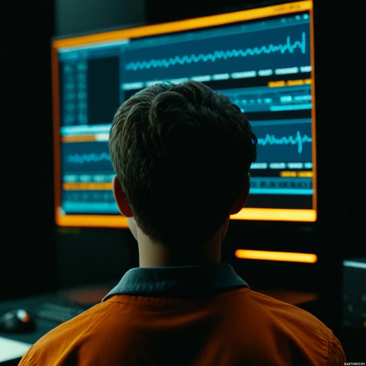 На картинке человек сидит перед компьютерным монитором, на котором отображается график с несколькими линиями. Судя по всему, он внимательно рассматривает экран, слегка наклонив голову. На нем оранжевый комбинезон, и спиной он повернут к камере.