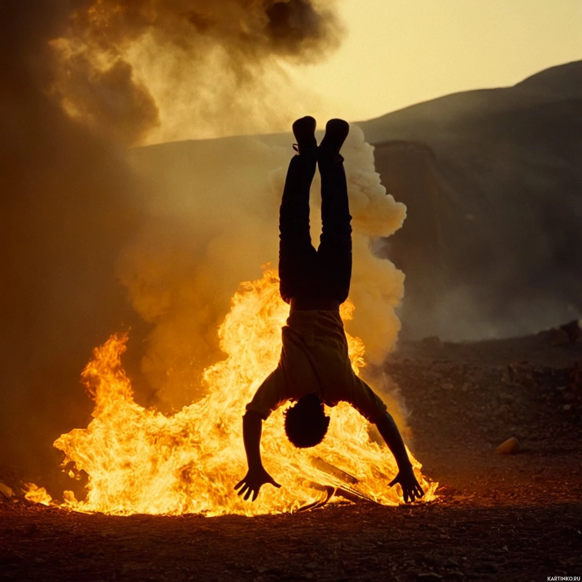 На картинке — силуэт мужчины, выполняющего стойку на голове над, кажется, огнём. Мужчина расположен в центре, а пламя видно под ним. По освещению, похоже, это закат или рассвет.