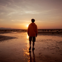 На картинке силуэт мужчины, стоящего на пляже на закате. Небо окрашено в оранжевые и жёлтые оттенки, создавая тёплое свечение. Мужчина стоит спиной к камере, и мы видим только его спину. На нём шорты, и кажется, он босиком, словно наслаждается неспешной прогулкой по берегу.