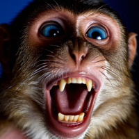На картинке два абсолютно одинаковых снимка обезьяны с преувеличенно разинутой пастью, словно она кричит или издает какой-то драматический звук. Шерсть обезьяны сочетает в себе черные и коричневые оттенки, у нее выделяется голубой глаз и видны зубы, подчеркивающие ее выражение лица. На заднем плане – темно-синий градиент, контрастирующий с яркими цветами морды и пасти обезьяны.