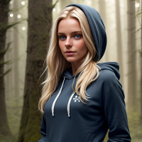 blonde hair, wearing a dark blue hoodie that appears to be branded. She stands in what looks like