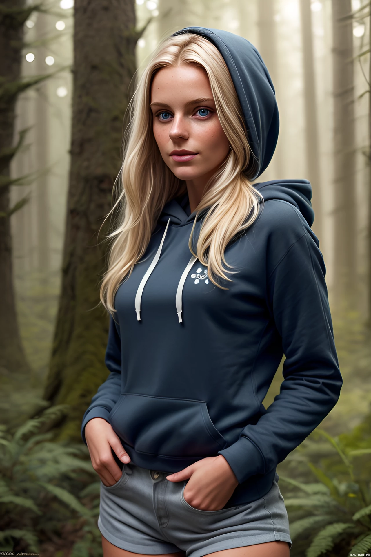 a forest setting, with trees and a misty atmosphere that suggests it might be early morning or late afternoon. Her pose is casual yet confident, with one hand on her hip and the other partially tucked into her pocket. The style of the image is realistic with