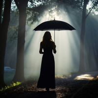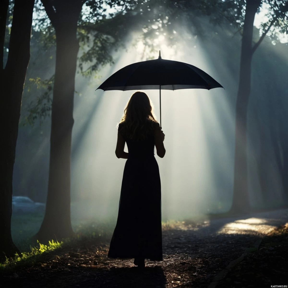 На картинке изображена женщина, стоящая на тропинке в туманном лесу. На ней темное платье, и она держит раскрытый зонт, словно защищаясь от непогоды. Освещение наводит на мысль об утренних или вечерних часах, создавая спокойную и безмятежную атмосферу. Её силуэт выделяется на фоне деревьев и тумана, придавая композиции ощущение глубины.