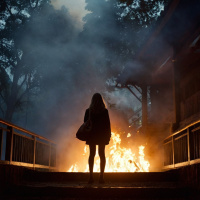 The image depicts a female figure standing on a stone walkway leading to a traditional Japanese building, which appears to be engulfed in flames. The woman is dressed in a dark-colored coat and carries what looks like a handbag over her shoulder. She is looking away from the viewer, towards the burning structure. A plume of white smoke rises from the source of the fire, enhancing the dramatic effect of the scene. The atmosphere suggests a sense of urgency or alarm, potentially indicating an emergency situation.