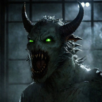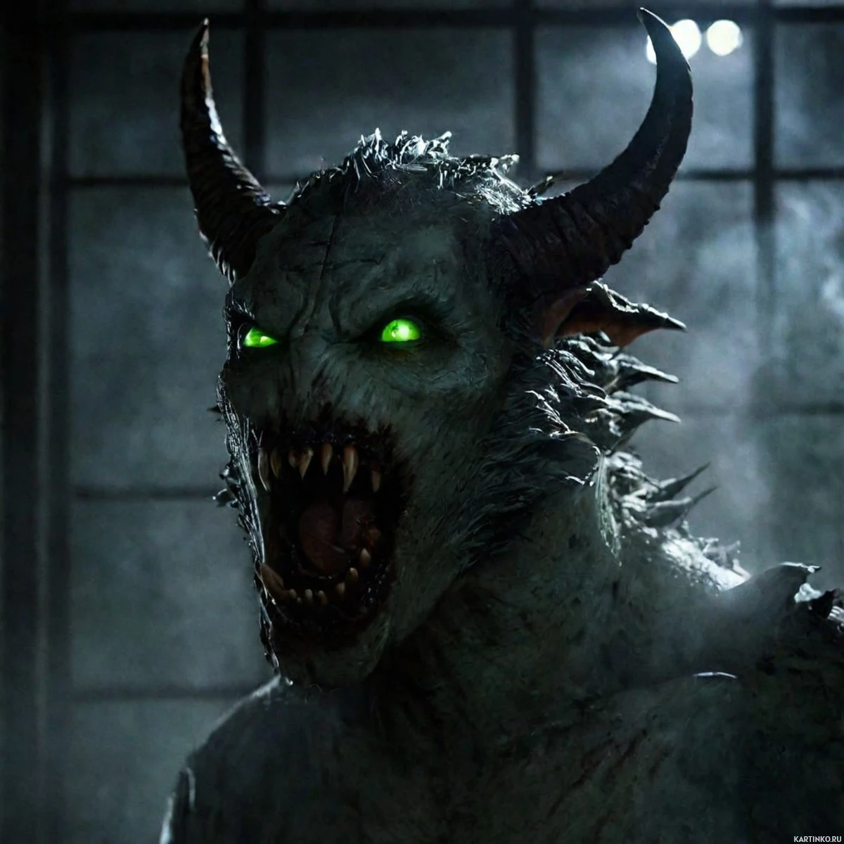 На картинке выделяется существо, похожее на демона или нечисти с заострёнными ушами и рогами. У монстра горят зелёными глазами, видны острые зубы, а тело покрыто тёмной слизью или кровью. Выражение его лица злобное, кажется, он рычит или издаёт хрипящий звук. У него мощное телосложение, а кожа грубая, что только усиливает его устрашающий вид. На заднем плане видны индустриальные конструкции из металла и трубы.