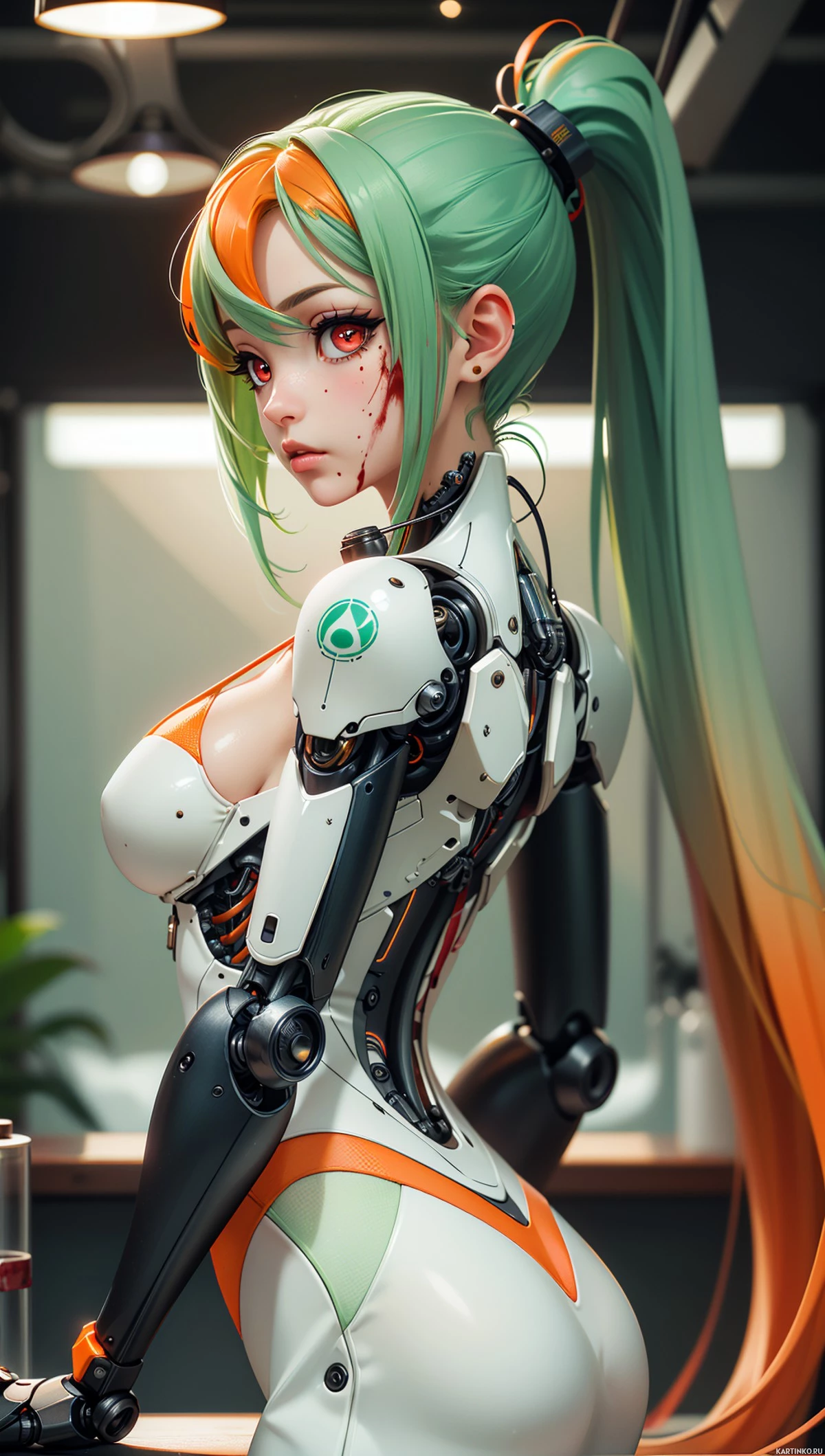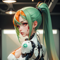 На картинке изображена девушка с зелёными волосами, уложенными в два пучка по бокам головы, в механическом костюме, который закрывает её тело, кроме верхней части груди и плеч. Костюм имеет серебристый металлический оттенок с заметными суставами и проводами, идущими к её торсу.