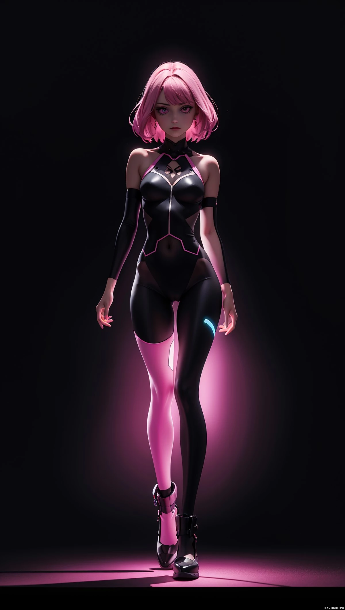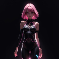 The image features a person standing against a backdrop with dramatic lighting. This individual has pink hair and is wearing a black, skin-tight bodysuit with a mesh pattern that suggests it might be made of metal or a similar reflective material. The suit appears to have some glittery accents or details that add to the futuristic or cyberpunk aesthetic. The person's pose is confident and poised, looking directly at the camera with a neutral expression on their face.