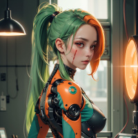 In the image, there is a figure standing in front of a desk. The figure appears to be a humanoid robot with green hair and orange-colored armor or skin. It has mechanical parts and is positioned facing away from the viewer, showcasing its back view. The setting includes what looks like a laboratory environment, with various pieces of scientific equipment and devices visible in the background, such as test tubes, beakers, and possibly a microscope or other analytical instruments. The figure's pose suggests it might be engaged in some kind of work or experiment at the desk.