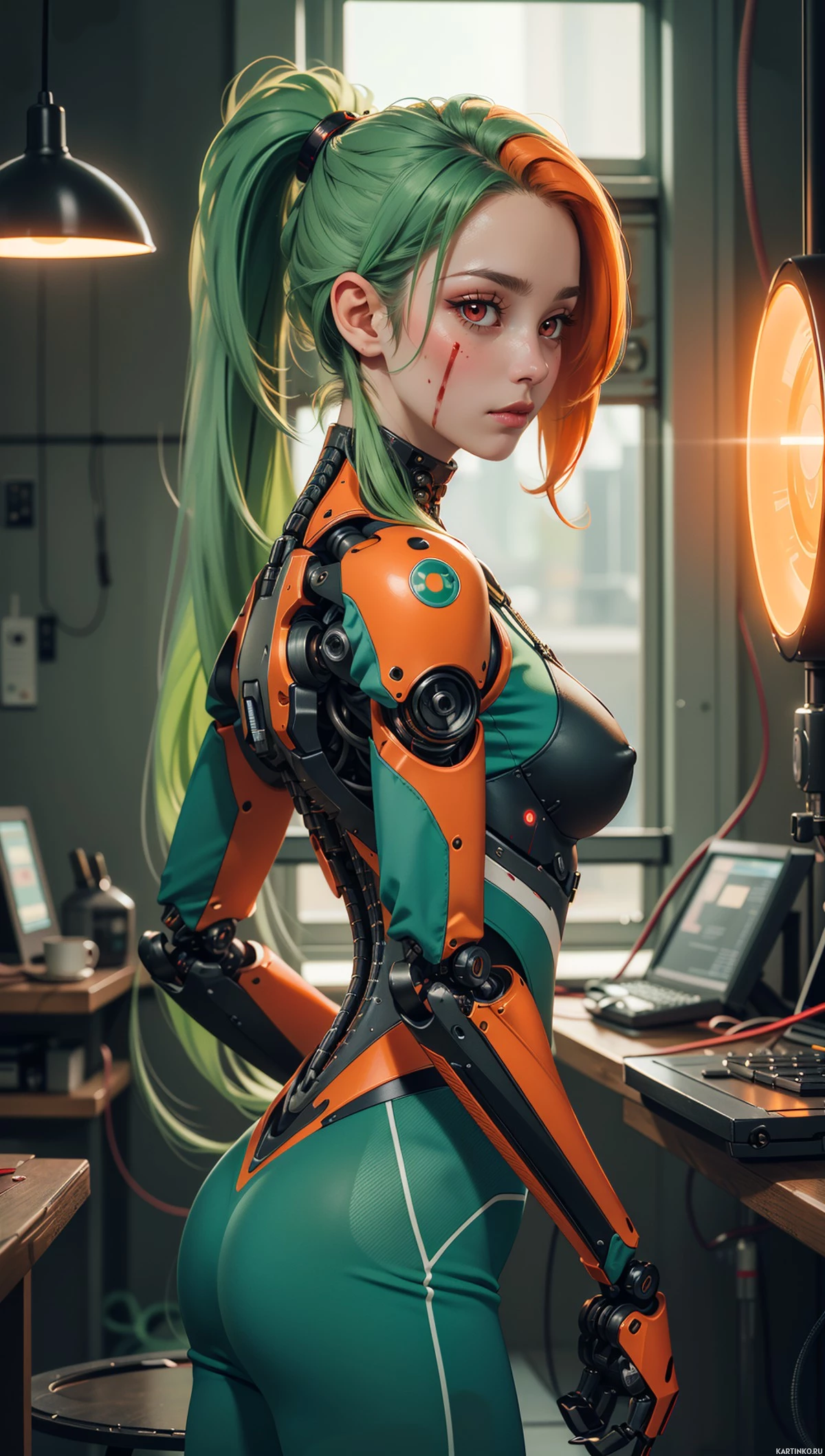 На картинке стоит фигура перед столом. Судя по всему, это гуманоидный робот с зелёными волосами и оранжевой броней или кожей. У него механические детали, и он стоит спиной к зрителю. На заднем плане виднеется, похоже, лаборатория, с различным научным оборудованием и приборами – колбами, мензурками, возможно, микроскопом или другим аналитическим оборудованием. Поза фигуры предполагает, что она занята какой-то работой или экспериментом за столом.