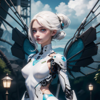 На картинке изображена девушка, явно из научно-фантастического сеттинга. У неё белые волосы и футуристический доспех, включающий в себя крыло на правом плече. На заднем плане видны пейзаж и мост вдалеке.