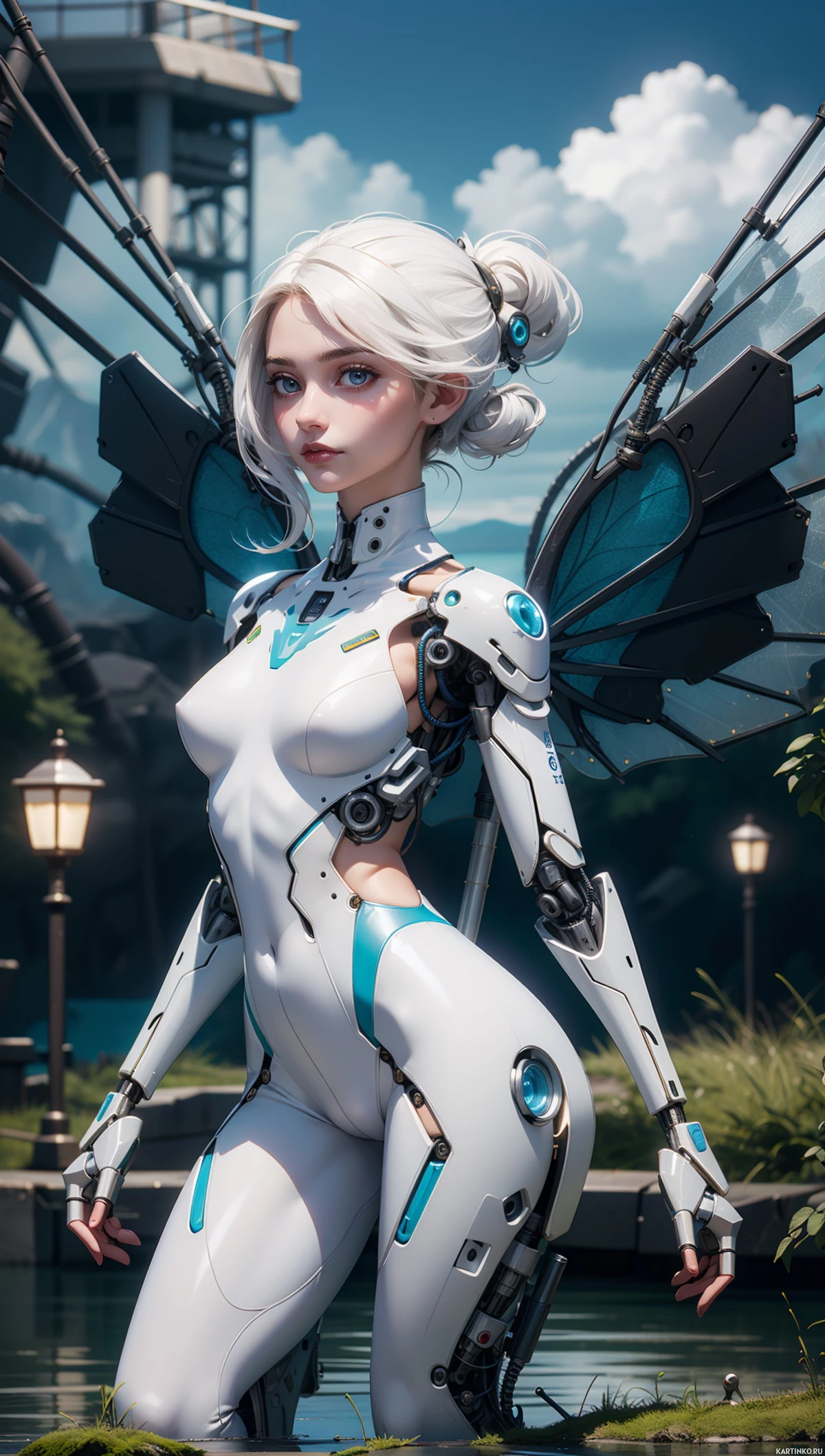 In the image, there is a female character who appears to be part of a science fiction setting. She has white hair and is wearing futuristic armor that includes a wing on her right shoulder. The background suggests an outdoor environment with a bridge in the distance.