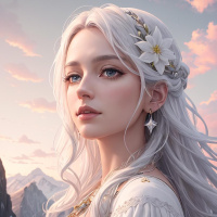 small flower, possibly a rose, is placed in her hair as an accessory. The background includes elements like a sunset with clouds, a mountain range, and what seems to be the silhouette of trees on the horizon, giving the impression that the character is situated in a serene,