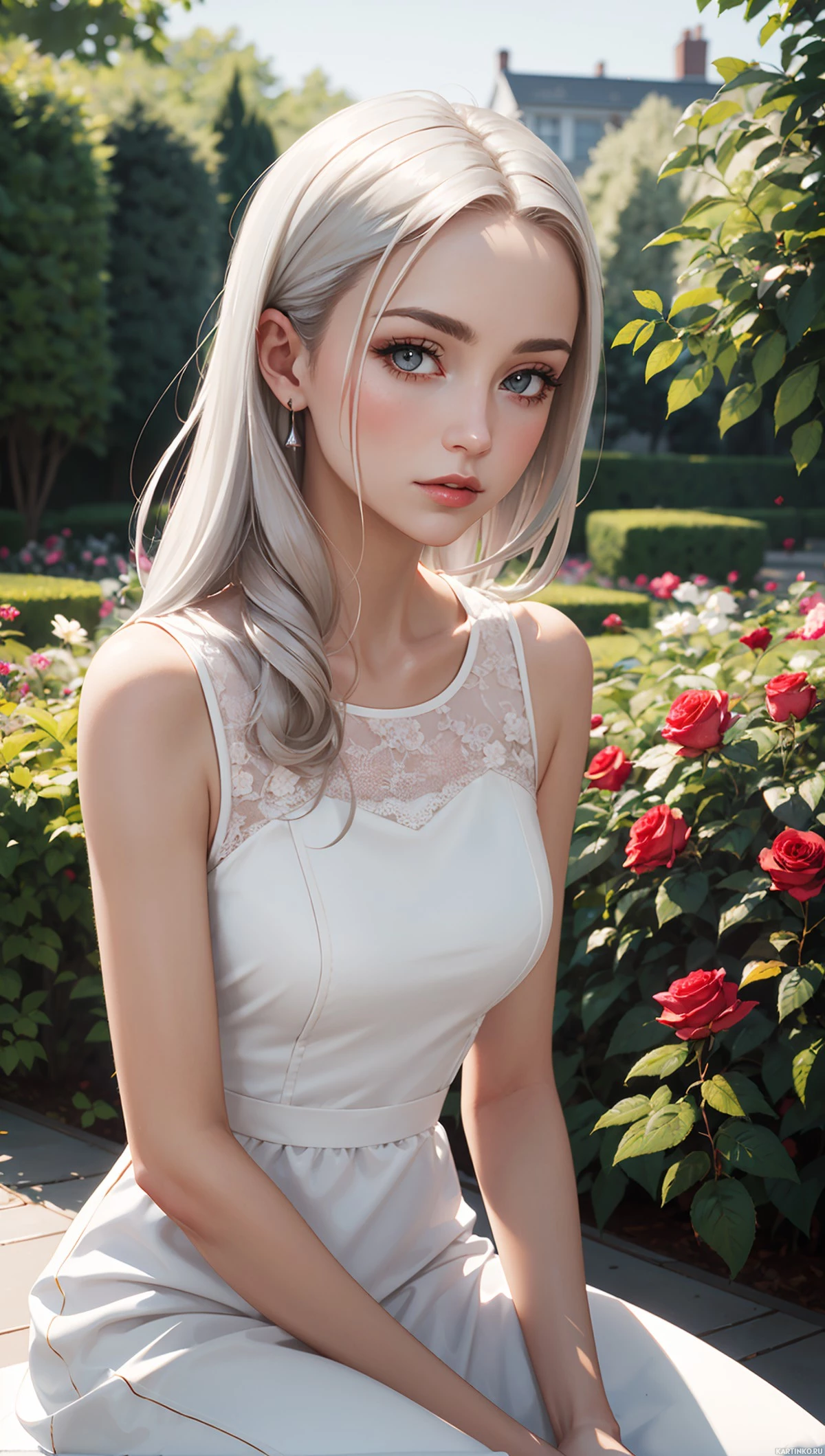 На картинке изображен человек с белыми волосами, уложенными в строгую форму. У него длинная прямая челка, закрывающая глаза, и макияж с выразительными бровями и, кажется, розовой помадой. На нем легкое, полупрозрачное платье молочного цвета с кружевными деталями, без рукавов. Человек сидит на земле, опираясь на куст роз, усыпанный цветущими бутонами. На заднем плане видны зеленые кустарники и деревья, что указывает на то, что действие происходит на открытом воздухе, возможно, в саду или парке.