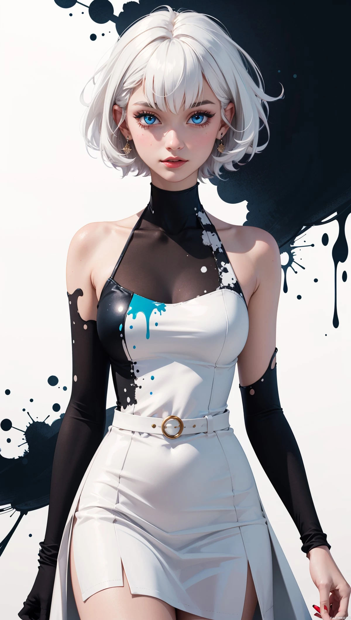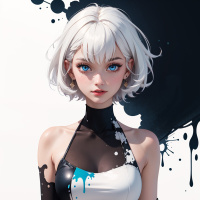 На картинке изображена женщина с короткой белой стрижкой, выполненной в стильном и современном стиле, с темным макияжем вокруг глаз. На ней – белое платье без рукавов с черными акцентами, напоминающее броню или часть костюма, судя по ремешкам и пряжкам на плечах. Справа виден круглый символ или логотип, возможно, обозначающий принадлежность или роль. Фон – однотонный и темный, создающий резкий контраст с её одеждой и подчеркивающий её присутствие в кадре. Черные брызги могут быть интерпретированы как краска или чернила, добавляющие художественный или драматический эффект. Выражение лица нейтральное, она смотрит прямо в камеру.