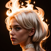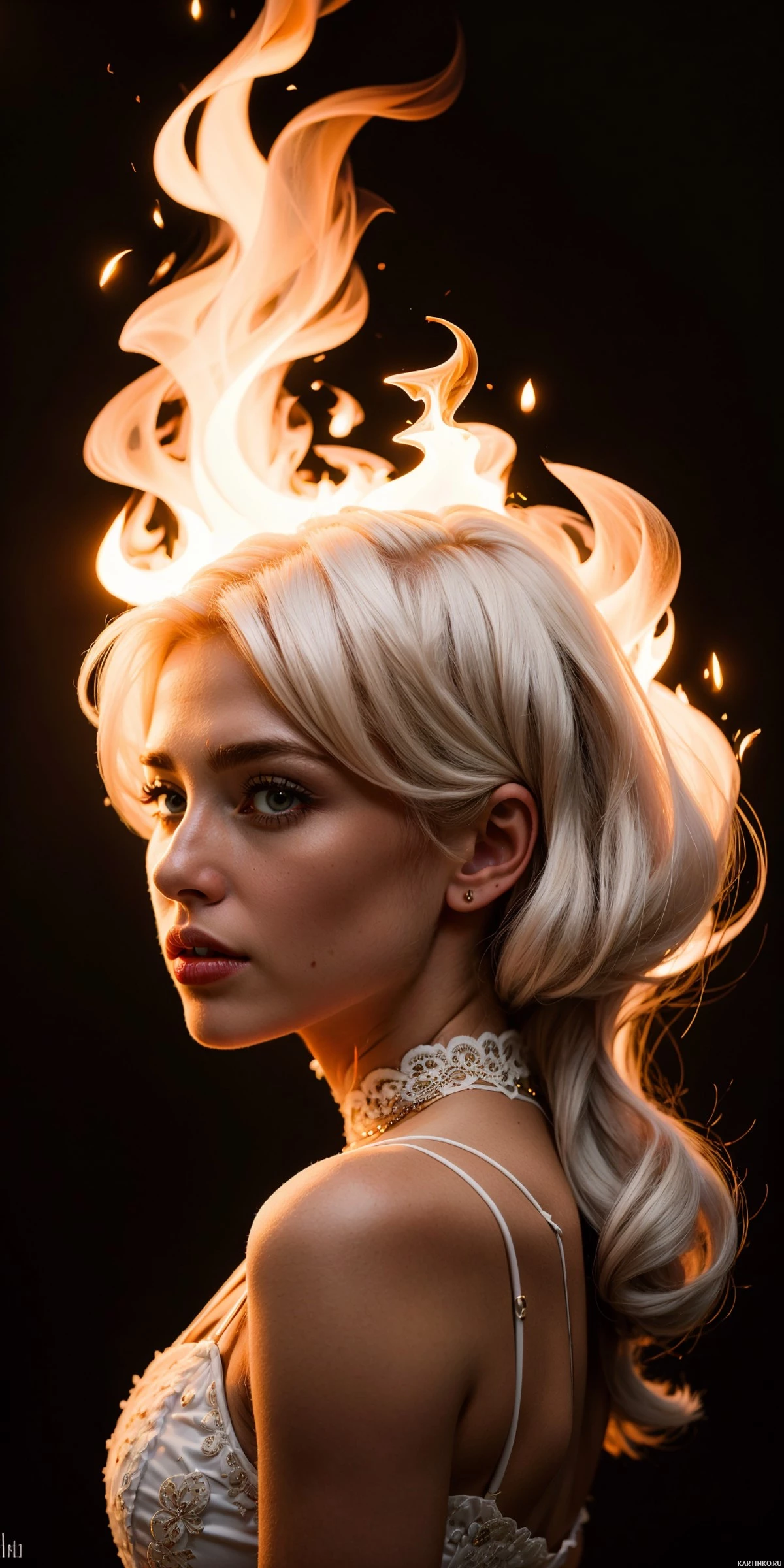 The image features a woman with blonde hair styled in an updo. She has dark eye makeup and is wearing what appears to be a metallic dress with a high neckline, which includes embellishments that could be interpreted as fire or flames due to their resemblance to the color and pattern of actual fire. The woman's expression is serious, and she is looking directly ahead, not at the camera.