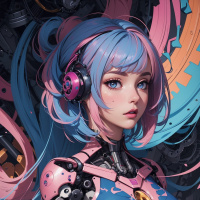 The image features a character that appears to be a blend of human and robotic elements, often associated with science fiction genres. The character has long blue hair styled in twin tails. They are wearing headphones over their ears and pink and black armor that covers the body, including what seems like a breastplate with circular patterns on it. There are details such as gears and mechanical parts visible on the armor. The character is looking directly at the viewer with a neutral expression. There is an artistic background that includes cybernetic or technological imagery, such as circuit-like structures and what appears to be a space or celestial theme due to the presence of a moon or planet in the backdrop.