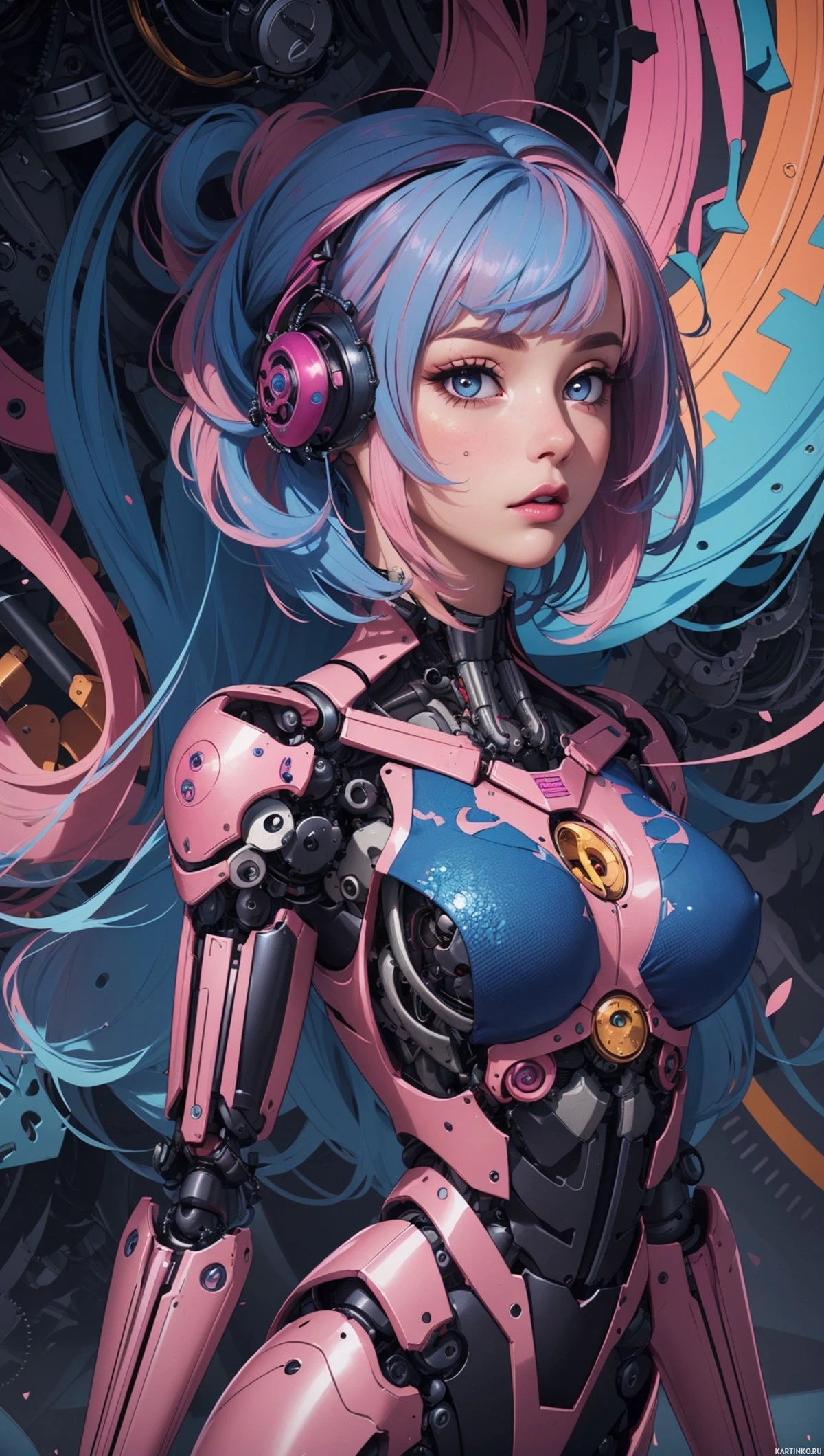 На картинке изображен персонаж, сочетающий в себе черты человека и робота, что характерно для научно-фантастических жанров. У него длинные голубые волосы, заплетенные в два хвостика. На голове наушники, а на теле – розовая и черная броня, включающая в себя нагрудник с круговыми узорами. На броне видны детали: шестеренки и механические элементы. Персонаж смотрит прямо на зрителя с нейтральным выражением лица. Фон выполнен в художественном стиле и включает кибернетические и технологические мотивы, такие как структуры, напоминающие электрические схемы, и космическая тема, что видно по луне или планете на заднем плане.