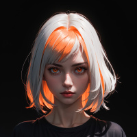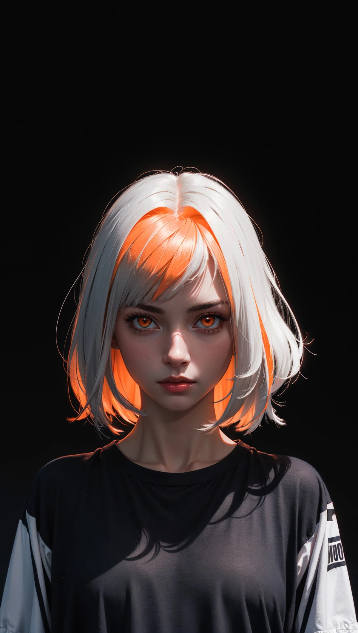 На картинке изображён человек с короткой стрижкой и андрогинной внешностью. У него белые волосы сверху и яркий оранжевый оттенок по бокам, а макияж включает розовые губы и заметные синие тени. На нём чёрный топ с высоким вырезом и белыми деталями, возможно, спортивного стиля. Фон тёмный, что создаёт контраст с цветными волосами и одеждой, выделяя человека на переднем плане.
