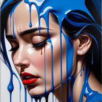 The image features a woman with closed eyes and an artistic design on her face that resembles paint dripping from her forehead. She has dark hair and lips in shades of red. Her skin appears to be painted or adorned with blue tones, giving her a unique, almost cyborg-like appearance. The background is plain white, highlighting the subject without any distractions.