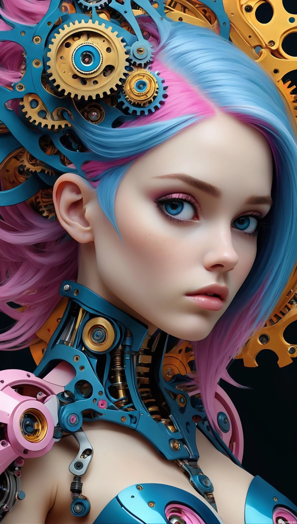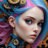 The image features a 3D rendering of an anthropomorphic female character with mechanical and cybernetic elements integrated into her design, giving her a robotic appearance. She has blue hair styled in bangs and spikes on the sides. Her skin is pinkish-purple, and she wears dark eyeshadow and lipstick that matches her hair color. The character's face shows a neutral expression, with a subtle smile. Her eyes are closed, adding to the serene or contemplative mood of the image. She is adorned with intricate designs on her head and shoulders, including gears and ornamental pieces that appear metallic in color. Her body has mechanical components visible, such as joints and pipes, suggesting a blend of organic and machine-like parts. The overall style of the image is sleek and detailed, with an emphasis on science fiction or cyberpunk aesthetics.