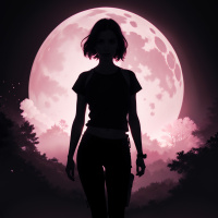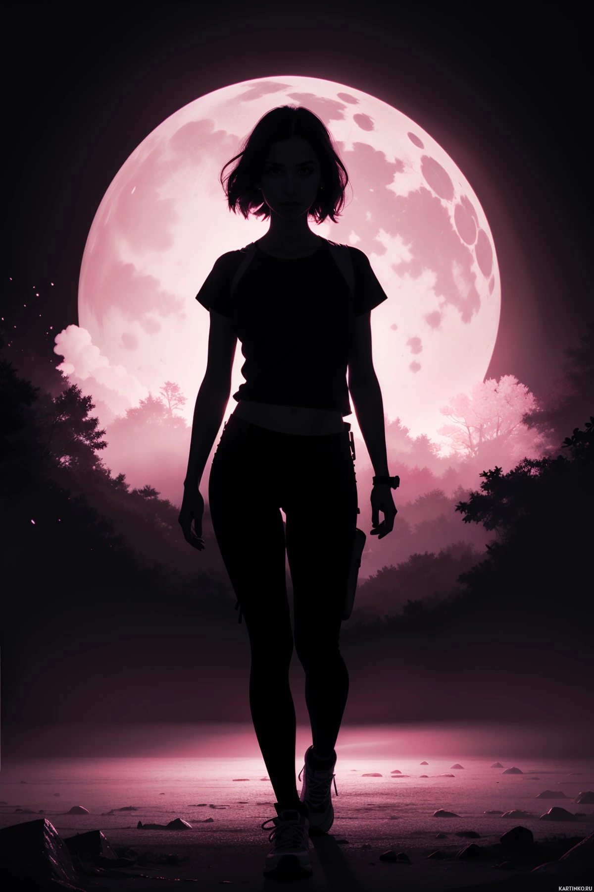 The image depicts a female figure standing in silhouette against a background that suggests it could be nighttime, possibly during the full moon given the pink hue of the sky. She is looking to her left and appears to be walking through what looks like an alpine forest or mountainous terrain. Please contact me for any further inquiries.