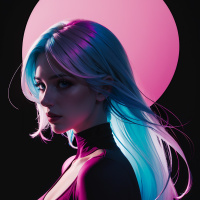 The image shows a person with long flowing blue hair and a somewhat contemplative expression, looking off to the side with a neutral gaze. The individual is styled in a fashionable manner, with a sleek hairstyle and makeup that includes shades of purple. They are wearing dark attire, possibly a jumpsuit or bodysuit, with a high neckline that seems to accentuate the shoulders and chest area. The background is monochromatic with warm tones, predominantly pink, which contrasts with the cooler blue hues of the hair. There appears to be a circular light source at the top, possibly mimicking the sun or moon, given its brightness and positioning above the head. The overall composition is artistic, with an emphasis on color balance and visual impact.