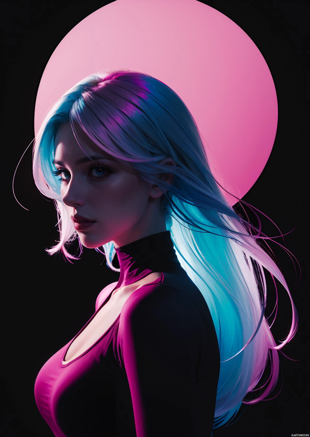 На картинке запечатлен человек с длинными, развевающимися голубыми волосами и задумчивым выражением лица, смотрящий в сторону с нейтральным взглядом. Образ человека стильный, с гладкой прической и макияжем, в котором преобладают оттенки фиолетового. На нём тёмный наряд, возможно комбинезон или боди, с высоким вырезом, подчеркивающим плечи и грудь. Фон монохромный, в тёплых тонах, в основном розовый, что контрастирует с холодными голубыми оттенками волос. В верхней части, похоже, расположен круглый источник света, возможно имитирующий солнце или луну, судя по его яркости и расположению над головой. Общая композиция художественная, с акцентом на цветовой баланс и визуальное воздействие.