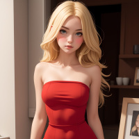 In the image, there is a female figure standing in a kitchen setting. She has long blonde hair and is wearing a sleeveless red dress that appears to be made of a glossy material, giving it a shiny look. The woman is also wearing black stockings and heels. Behind her are elements of a typical home kitchen, including cabinets, countertops, and what seems to be a framed picture on the wall. The lighting in the photo is bright, suggesting either natural sunlight or strong artificial lighting.