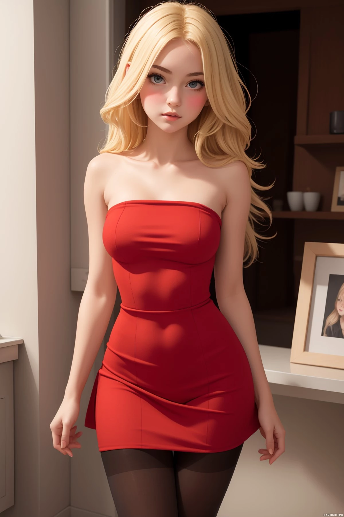 На картинке изображена женщина, стоящая на кухне. У неё длинные светлые волосы, а на ней – красное платье без рукавов из блестящей ткани. Она также надела чёрные колготки и туфли на каблуке. На заднем плане – обычная кухонная обстановка: шкафы, столешницы и, кажется, фотография в рамке на стене. Освещение яркое, похоже на естественный свет или мощное искусственное освещение.