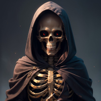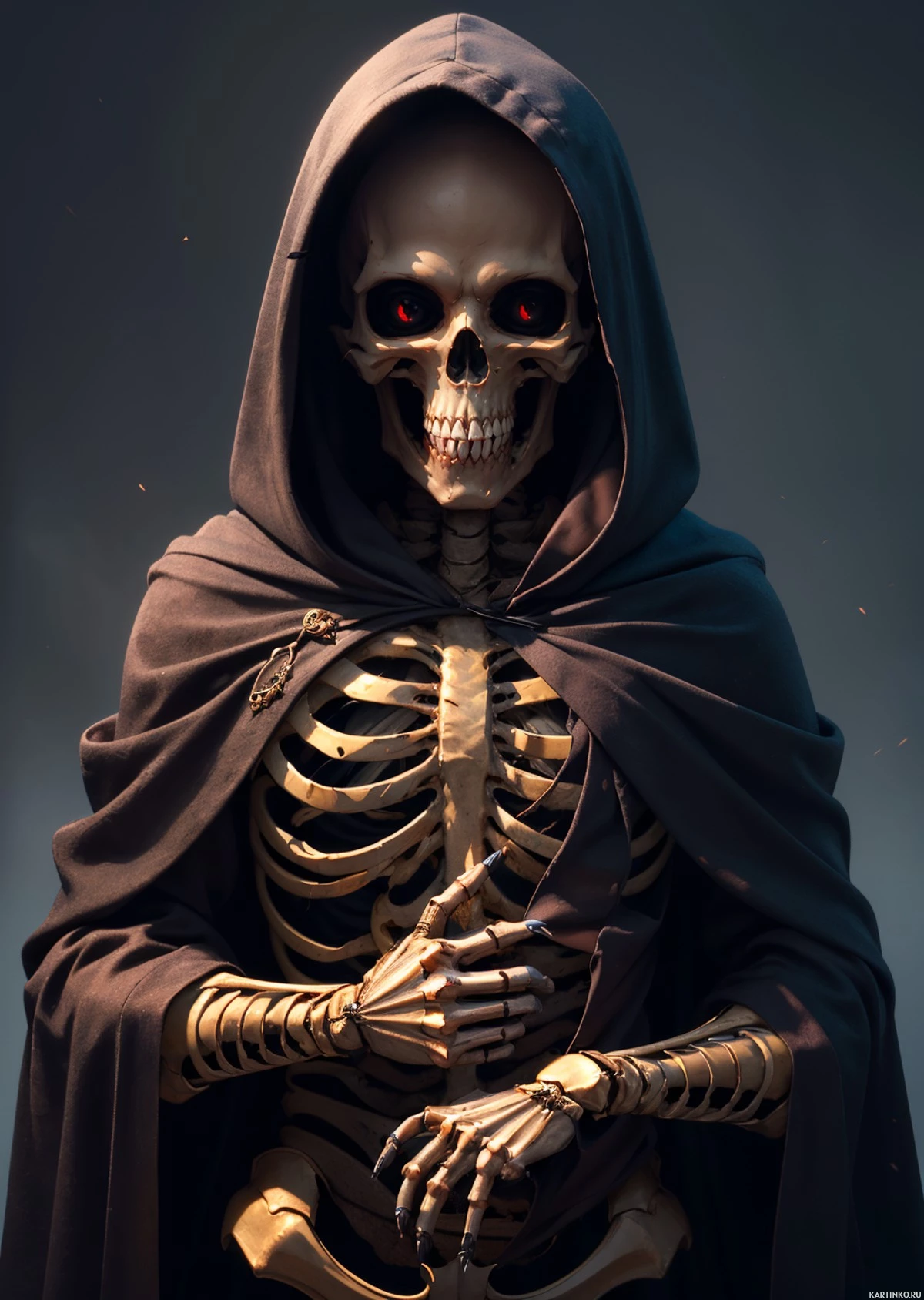 В переднем плане стоит фигура, напоминающая человека, но с костяной структурой. Голова выглядит как череп, с детально прорисованными чертами: пустые глазницы, видные зубы. На фигуре накинуто что-то вроде капюшона, темно-синего или черного цвета. Волос не видно. Левая рука нежно покоится на груди, правая – вдоль тела. Фон темный и мрачный, что создает контраст с освещенной фигурой, намекая на осознанное использование света и тени для выделения персонажа.