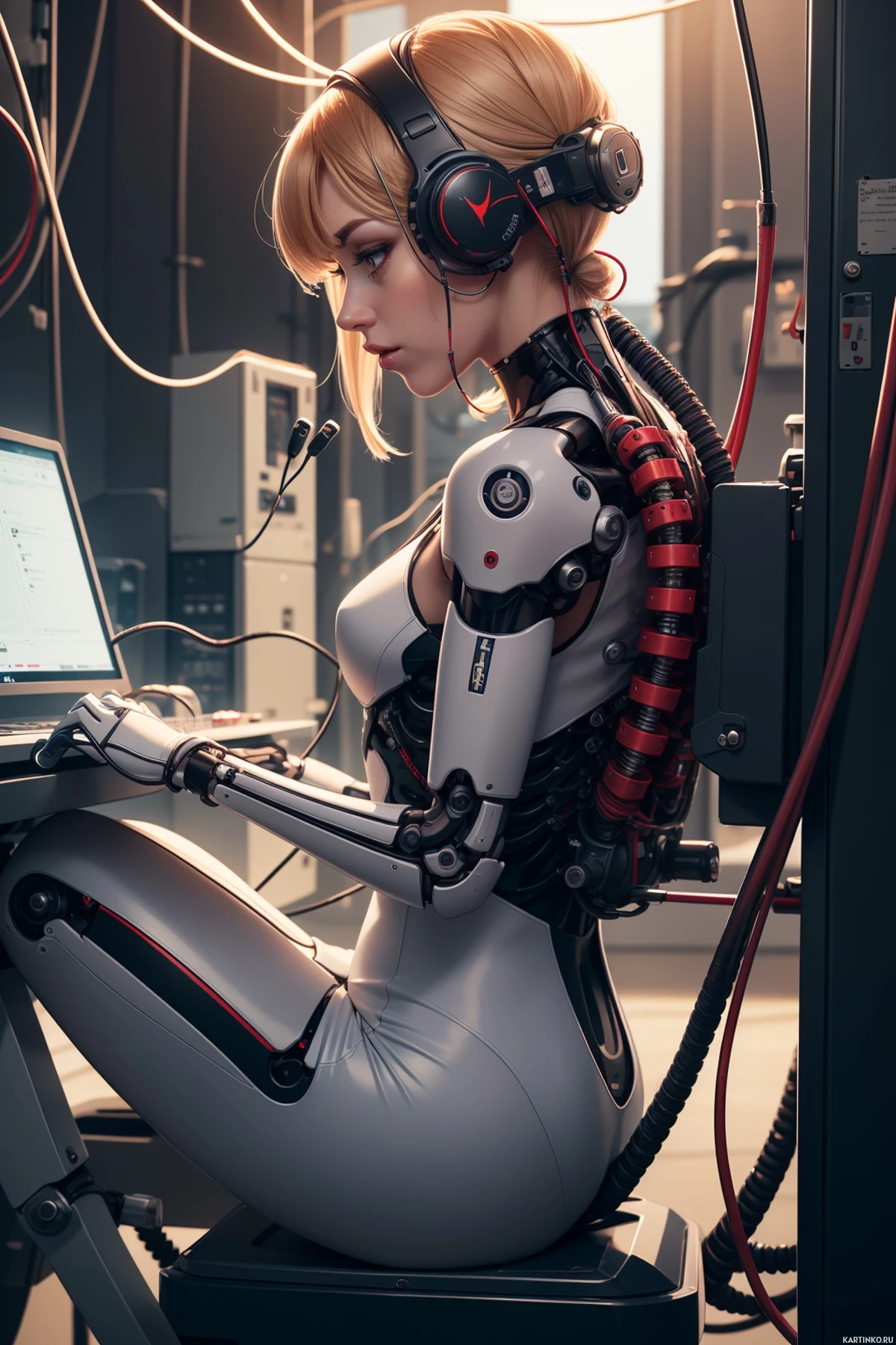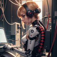 На картинке изображена девушка в футуристическом бронежилете с светлыми волосами и наушниками. Она сидит за компьютером, вокруг неё — провода и различное оборудование, создавая атмосферу научно-фантастического сеттинга.