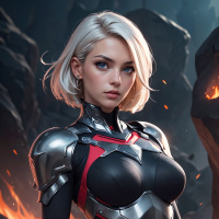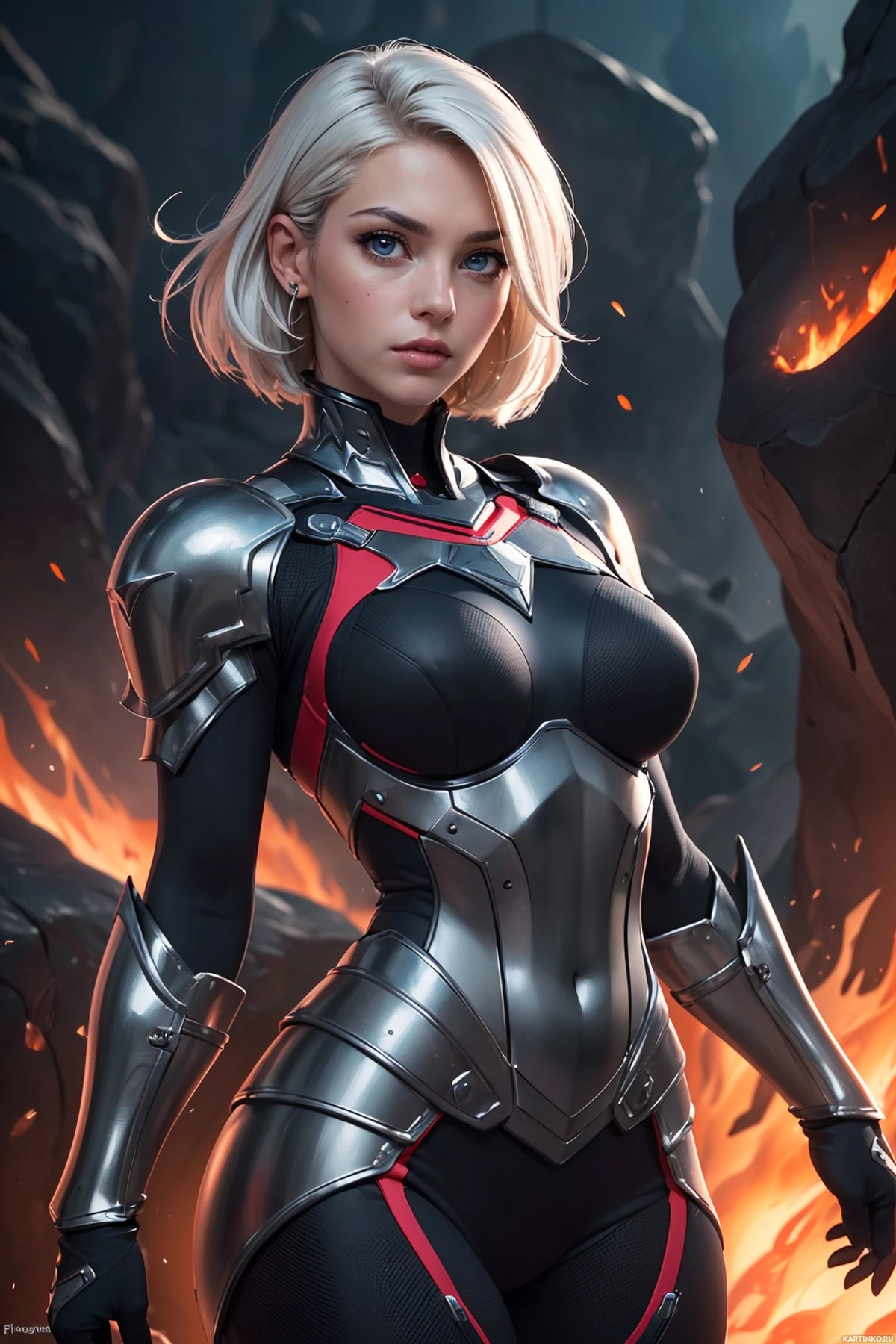 Цифровая картинка девушки с белыми волосами. Она изображена в бронированном костюме с красными акцентами, уверенно стоящей посреди хаотичной обстановки с огненными эффектами вокруг.