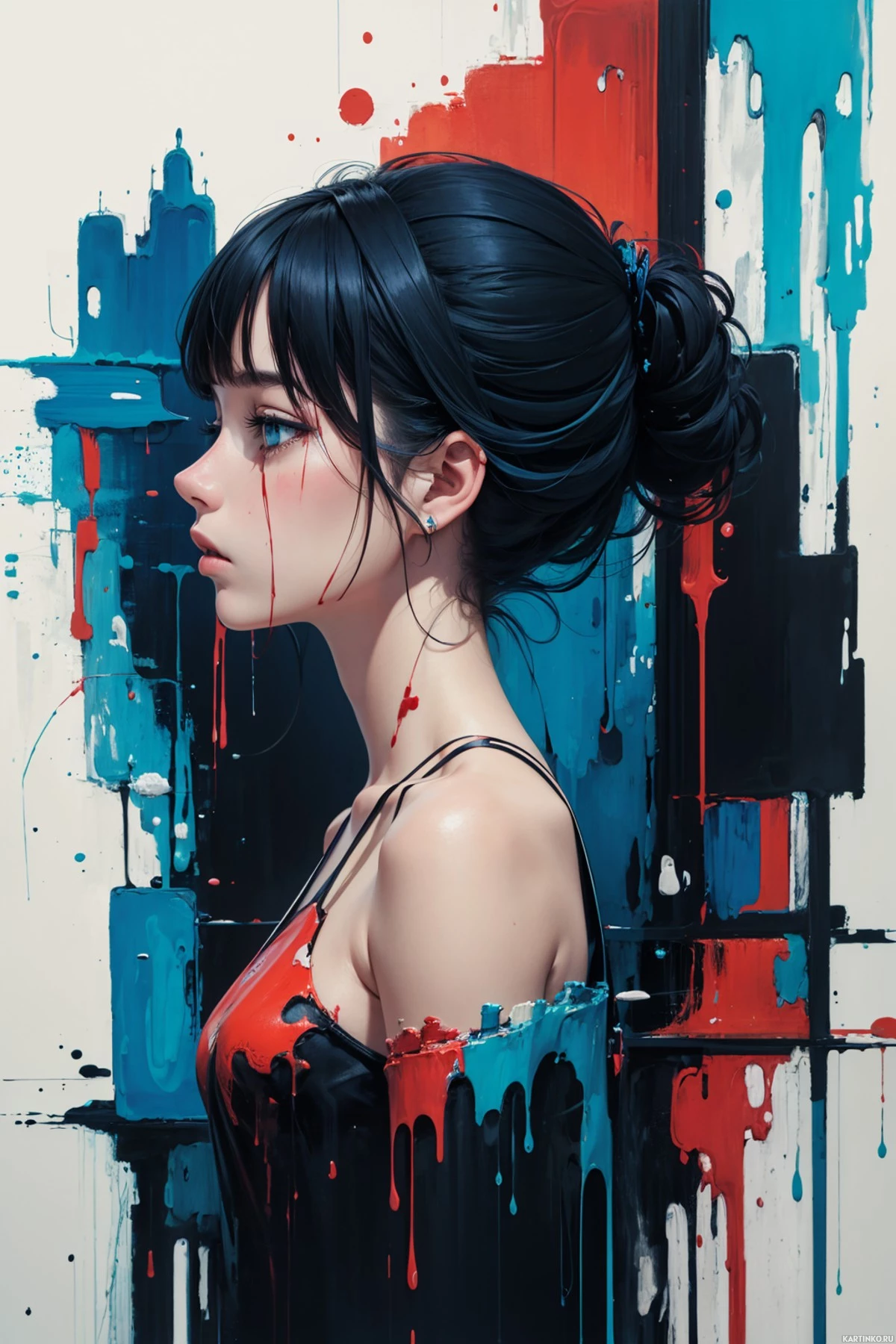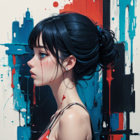 The image features a stylized portrait of a woman with blue hair. Her eyes are focused downward, and her lips are slightly parted in a contemplative expression. She has painted red streaks on her face and neck. Her attire consists of what appears to be a black bodysuit or corset. The background is abstract with splashes of color that resemble paint drips, primarily blue and white, suggesting an artistic theme.