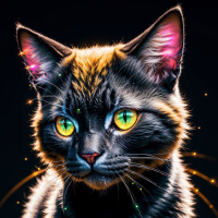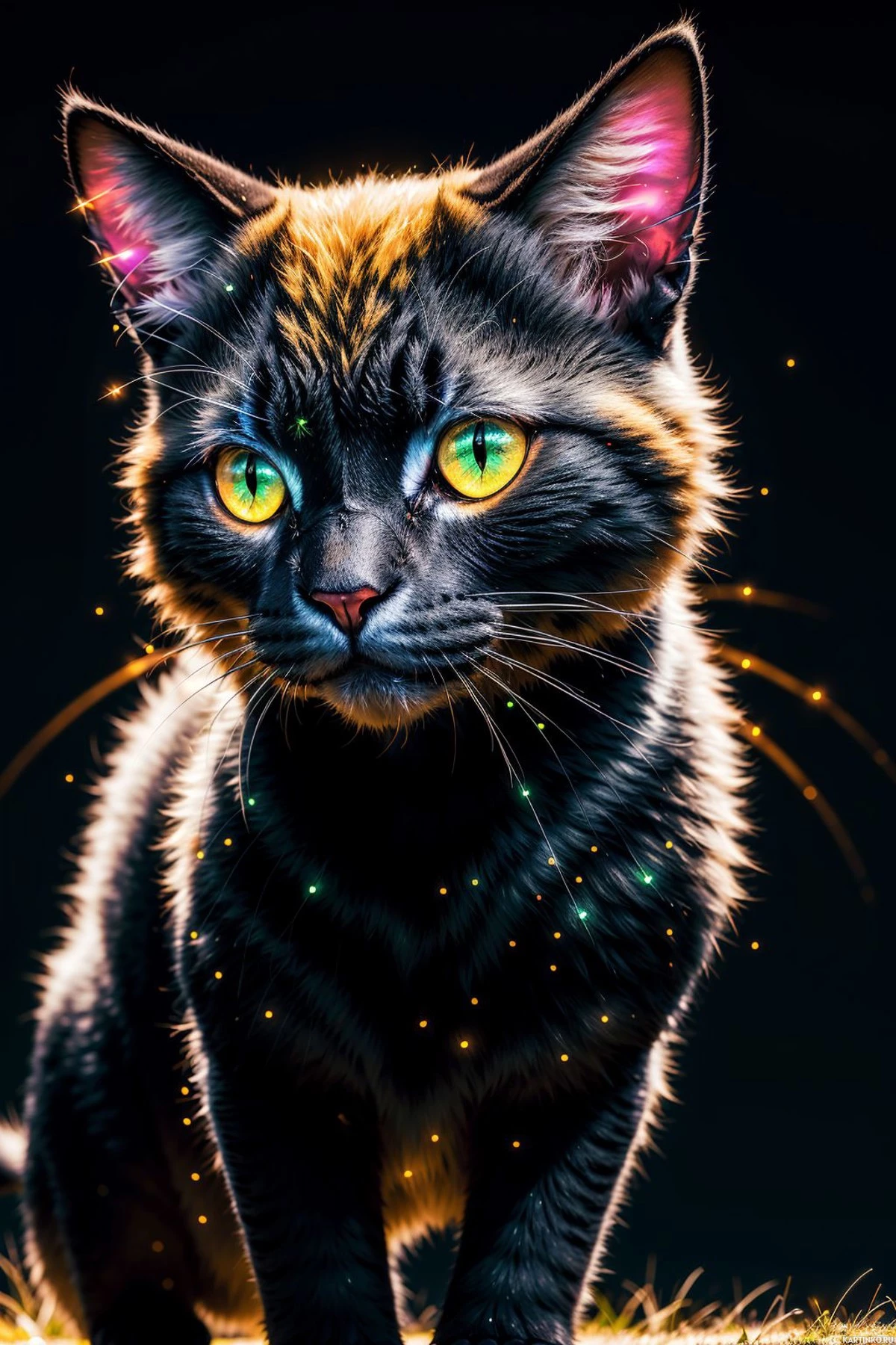 На картинке крупный план кошки с пронзительными зелёными глазами и тёмной шерстью, стоящей на земле или коре. Вокруг мордочки кошки мерцают маленькие искорки, придавая ей неземной, волшебный вид. Стиль картинки детализированный и немного сюрреалистичный, что наводит на мысль, что она могла быть создана в цифровом формате или является цифровой работой, а не фотографией реального пейзажа. В целом картинка создаёт очень атмосферное настроение и ассоциируется с фантастическими мотивами.
