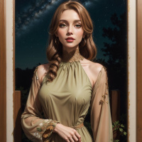 The image features a person standing against an astronomical background with stars twinkling in the dark sky and a crescent moon hanging above a forest. The person is wearing a long, embellished gown that has intricate designs and appears to be of a historical or fantasy style, possibly indicative of a character from a fairy tale or a costume party. The individual has long hair and is gazing off into the distance with a calm expression.