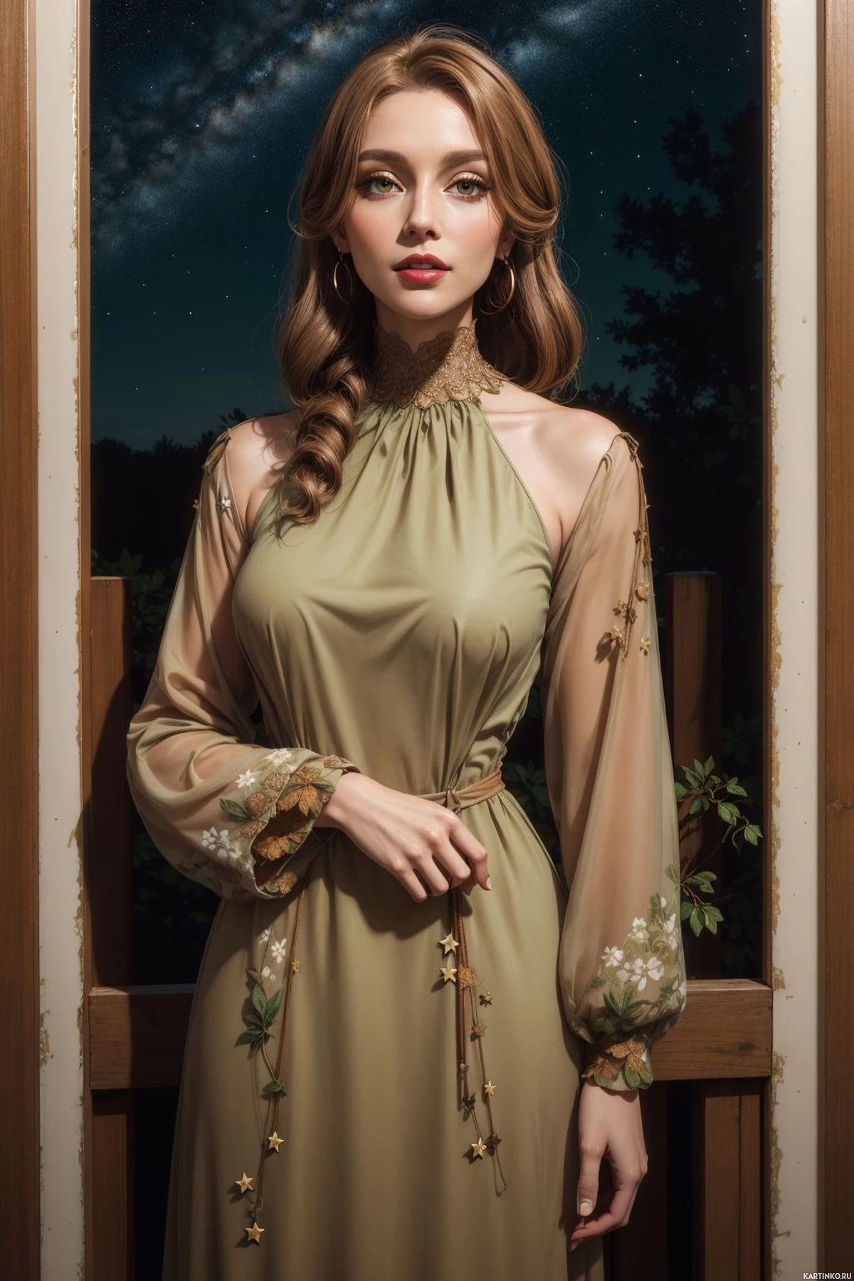 На картинке изображена фигура, стоящая на фоне звездного неба, усыпанного мерцающими звездами, над темным лесом повисла тонкая серпа луна. На ней длинное, богато украшенное платье с замысловатым орнаментом, похожее на костюм из исторической эпохи или сказочного мира. У человека длинные волосы, и он спокойно смотрит вдаль.